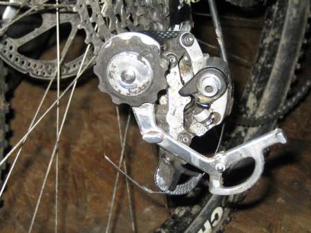 seine Kette wäre abgesprungen. Aber es war geringfügig schlimmer. Sein X.O - Schaltwerk war gesprengt, ein Teil des Käfigs komplett weg. Da Scott bei seinen Highend Bikes auf geschraubte